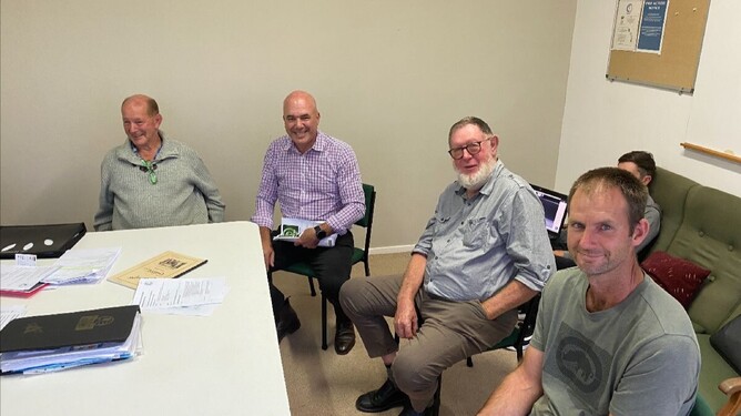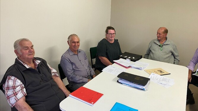 The Coopers Beach Camp trustees meeting together. Above, from left: William Savill, Vince Mason, Lynley Fleming, and Reg Carr. Below, from left: Reg Carr, Craig Johnson, Mike Flay and Andy Fleming (standing in for John Aish)