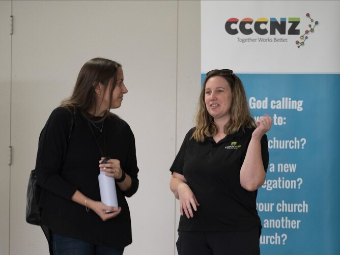 In the photo above Kylie Brown (left), Children's Pastor at Lifezone Church, is chatting with Anna Baldwin (right) from Totara Springs Christian Centre.