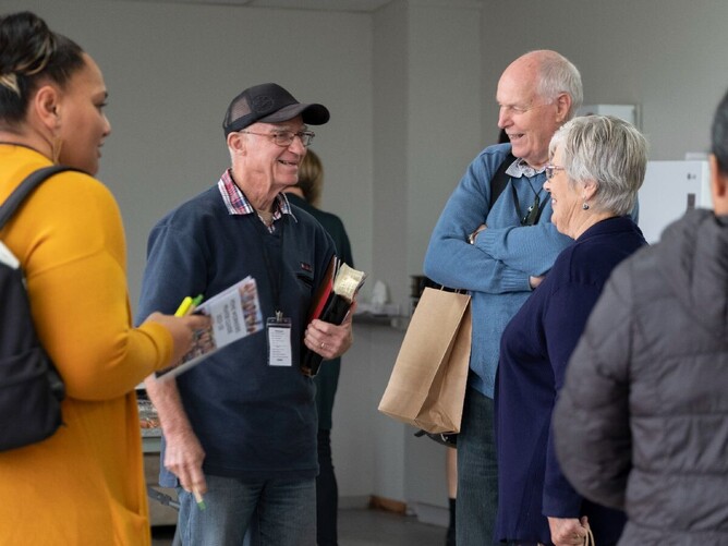 Kath Lind (above, centre) from Raleigh Street Christian Centre is chatting with the team from Tauwhare Gospel Chapel.