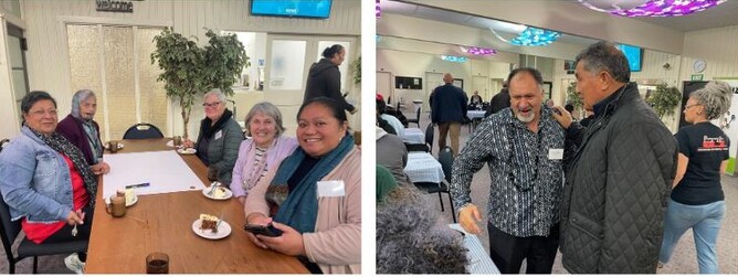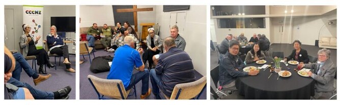(Above right) Robert Siakimotu (Onehunga Bible Church) chats with Jerome Edwards (Tāmaki Community Church) before dinner.