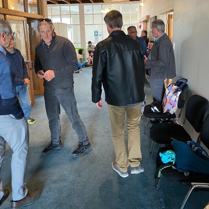 After the Auckland Japanese Church service which meets on Sunday afternoon at ABC’s Ngaire Ave Campus, members stay on and connect in small groups. Campbell McSkimming (Rossgrove Bible Chapel) stands talking in the church foyer with elders from three central Auckland churches (Terry Street Bible Chapel and Wiremu Street Bible Chapel) before a meeting to share ideas.