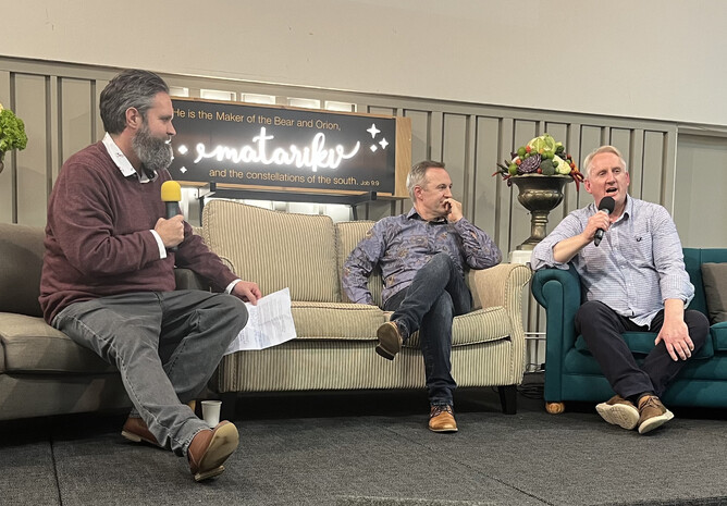John and Wendy Buchanan from Chapel Hill Community Church, Frank Scrimgeour from Hillcrest Chapel, Kemp and Anne Pallesen, who have been involved in all the churches represented, and Jenny and Graham Jacobsen from Northgate Community Church formed a panel to tell the shared history of their churches and the different ways God has moved over the years.