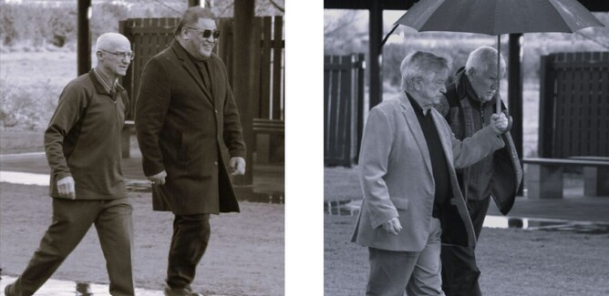 Top: Tauwhare Elder Andy Millar with Kaumatua Tom Wheki. Bottom left: Norm Silcock and Te Mape Haimona. Bottom right: Brian Goodwin and Kemp Pallesen