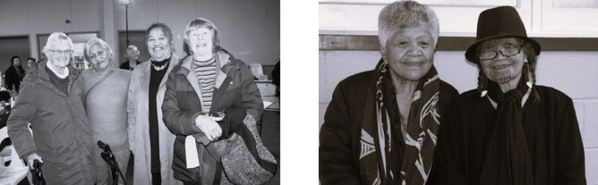 Left: Betty Pallesen, Mary Rapana, Taumoana Rapana, Anne Pallesen. Right: Kuia Marilyn Te Aho and Ngaromo Beazley