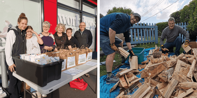 Left photo: from left to right, Kelsey Rhodes-Robinson, Evie Joyce, Annette Linklater, Sharon Mee, Sally Rowe, and Jim Linklater ready to distribute meals and baking. Right photo: Stuart van Rij and Ross Lloyd shifting firewood.