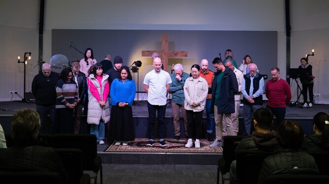 Samantha Rodrigues and Sarah Halim being prayed for by Mark Wallace and the church family.