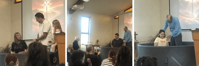 Kathy, Joe, and Gabby being baptised on Easter Sunday.