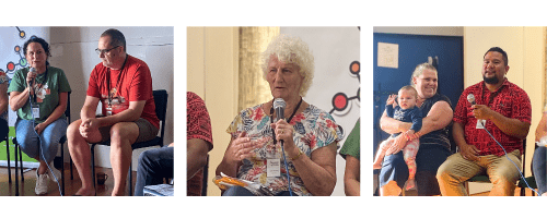 Janet Fleming (centre above) shared her story of how God is using her book of poetry “Through the Years” published in 2024. Janet and Mike Fleming attend Tōtara North Bible Chapel.