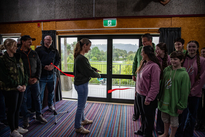 Willow Park Camp Manager Michelle Willis welcomes Highland Home to Te Maru by cutting the ribbon.