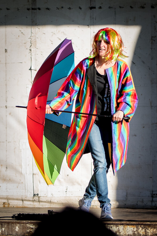 A gospel talk from the outdoor stage, with Debora Dos Santos engaging families in bright colours