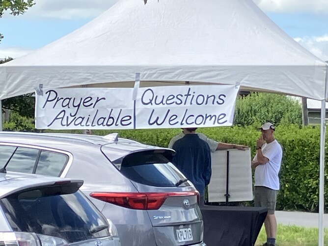 A gazebo was positioned by the entry and exit point, with HCC elder Richard Howe and two local evangelists offering prayer and welcoming questions from curious visitors. While most younger guests were more interested in candy floss and jumping activities, several parents and grandparents engaged in thoughtful conversations, and at least one visitor gratefully took home a gift of a Bible.