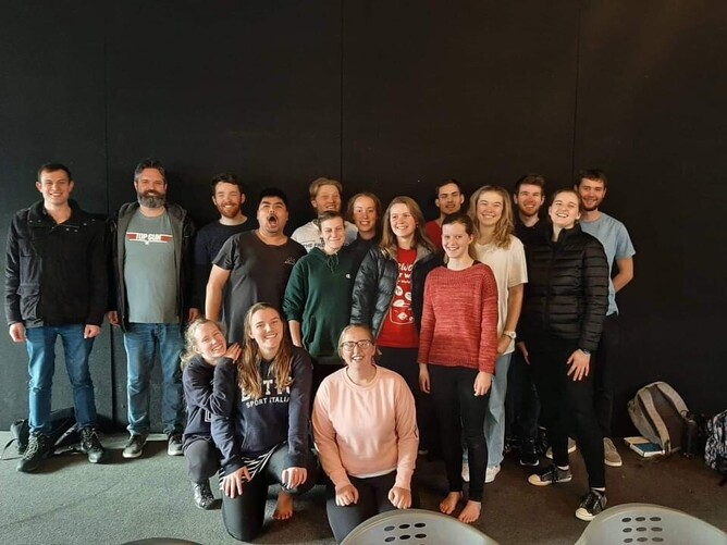 In the cast (above) are Chris Chalmers and Danny from Agora Church and Hannah Goodwin from Raleigh Street Christian Centre. Liam Labuschagne, from Te Awamutu Bible Chapel who is sixth from right in the red t-shirt. From Hukanui Bible Chapel are Donovan Kruger (fifth male from left) Lizzie Gilling (next to Donovan), Jenna Gilling (between Lizzie and Hannah in puffer jacket), and Joella (middle of the kneeling trio).